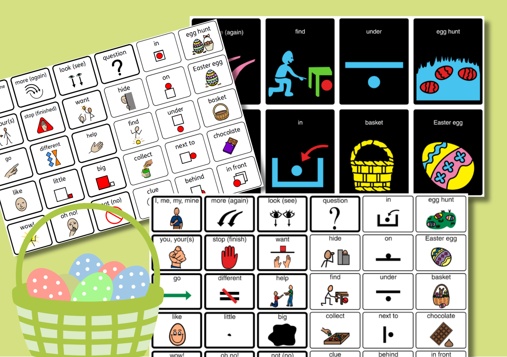 8, 16 and 30 location symbol charts to support communication when going on a egg hunt. Ask for or give clues to find eggs and fill up your basket!